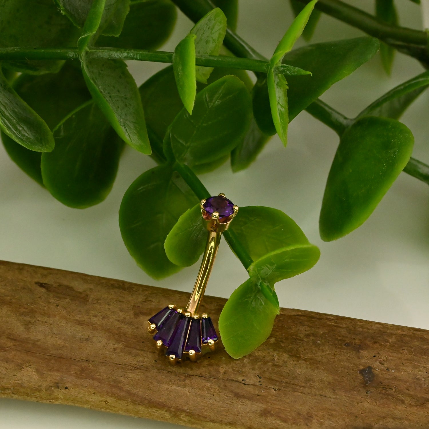 Crafted from 14K gold and designed with an upside down Oceane 5 featuring 6mm x 8.5mm 5 Gem Tapered Baguette Cluster with 3mm x 2mm x 1mm, 4mm x 2mm x 1.5 mm & 5mm x 2mm x 1mm gems & 3.5mm Round prong top, this Navel Curve will make a statement in any outfit and is sure to turn heads. Show off your unique look and purchase today.