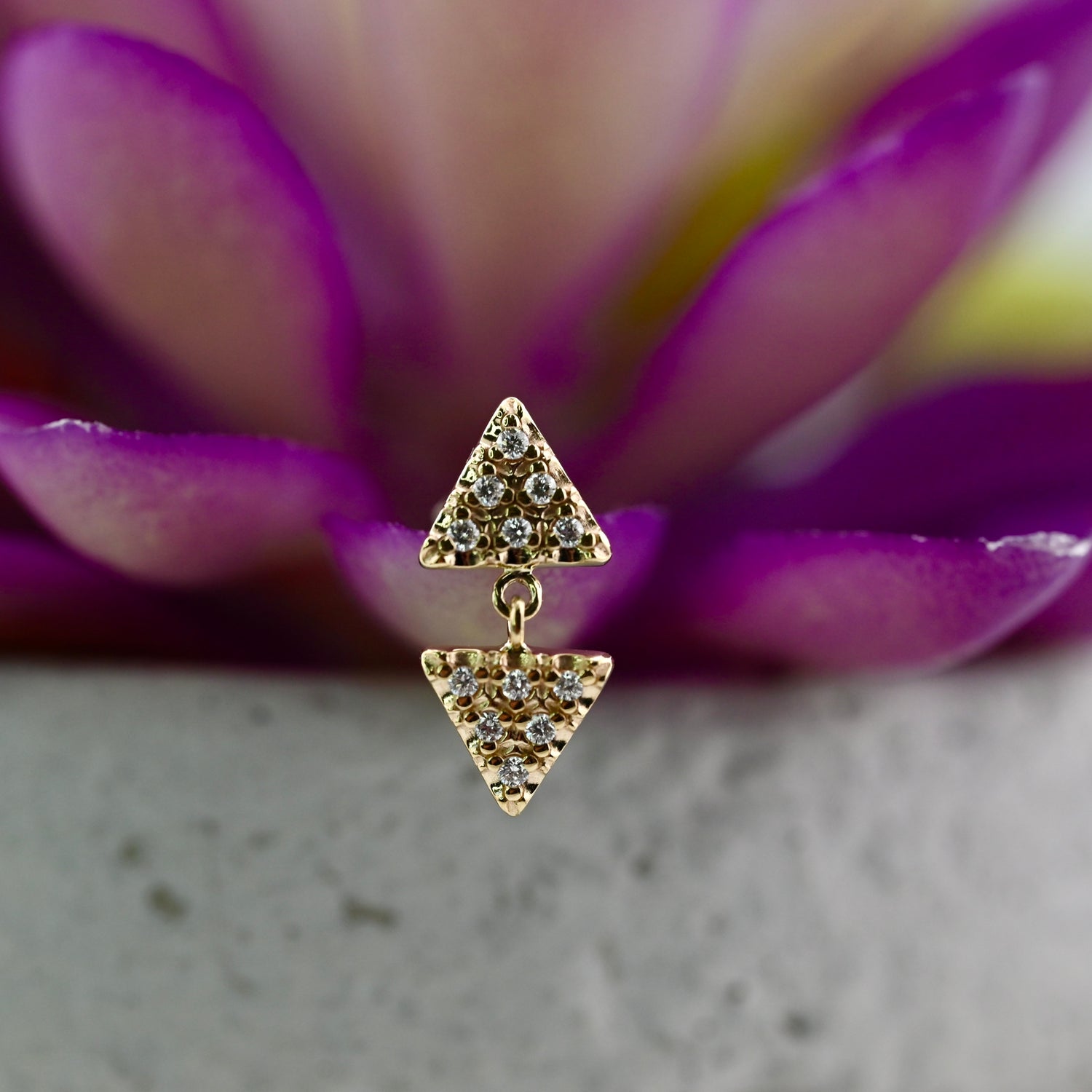 14K (2) 6mm Pave Triangles connected by 2 tiny jump rings. (12) 1mm Gems.