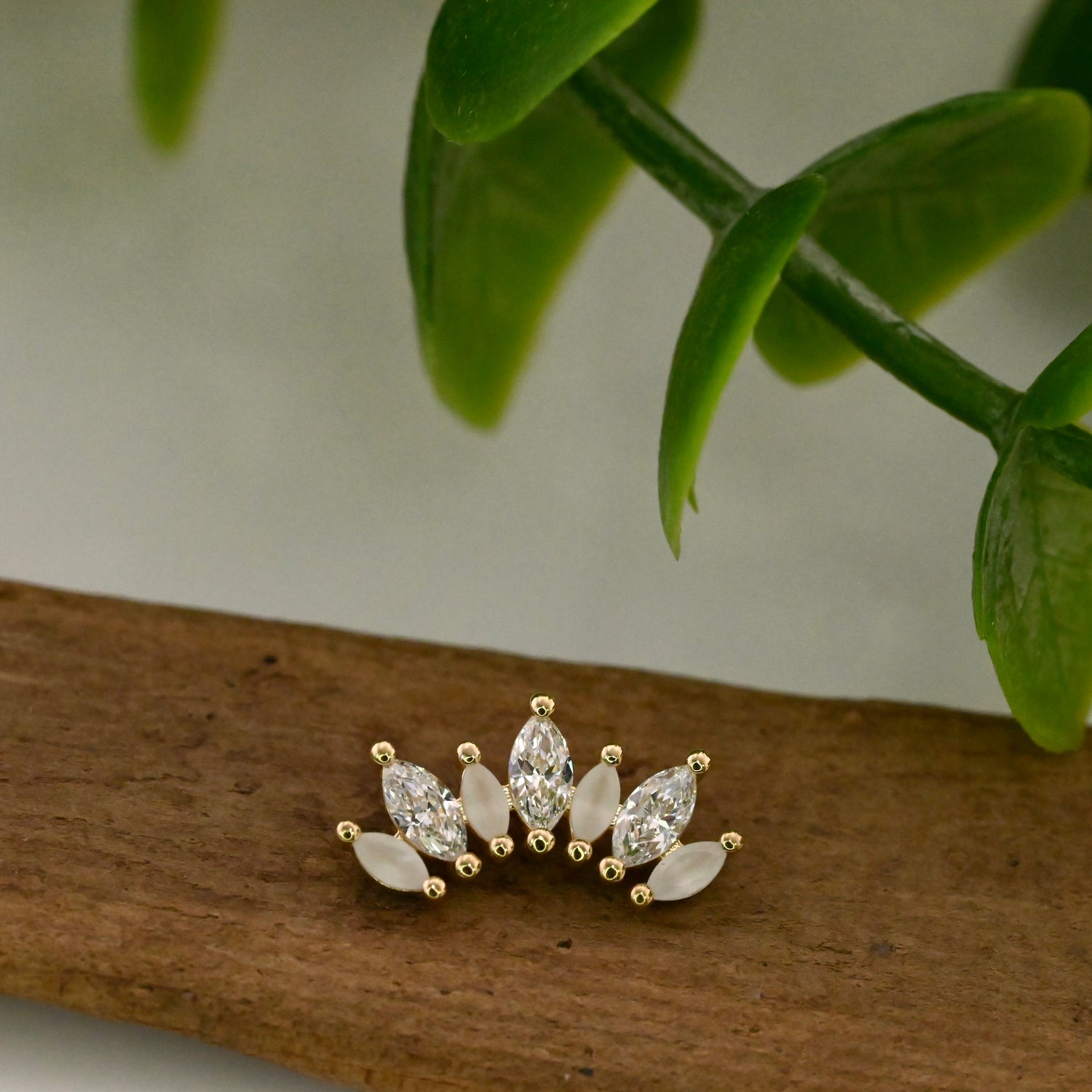 Athena is an exquisite jewelry piece set in 14K Gold, is approximately 12.5mm in length and features (6) alternating 4mm x 2mm & 3mm x 1.5mm Marquise cut gemstones.