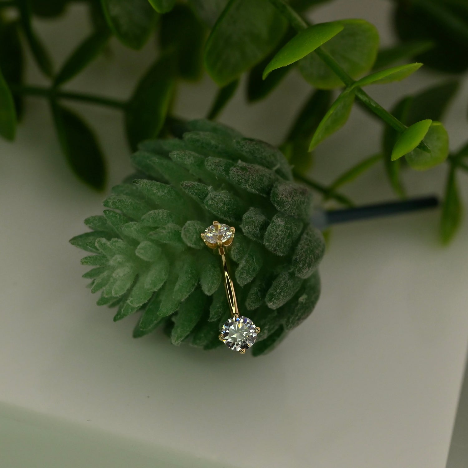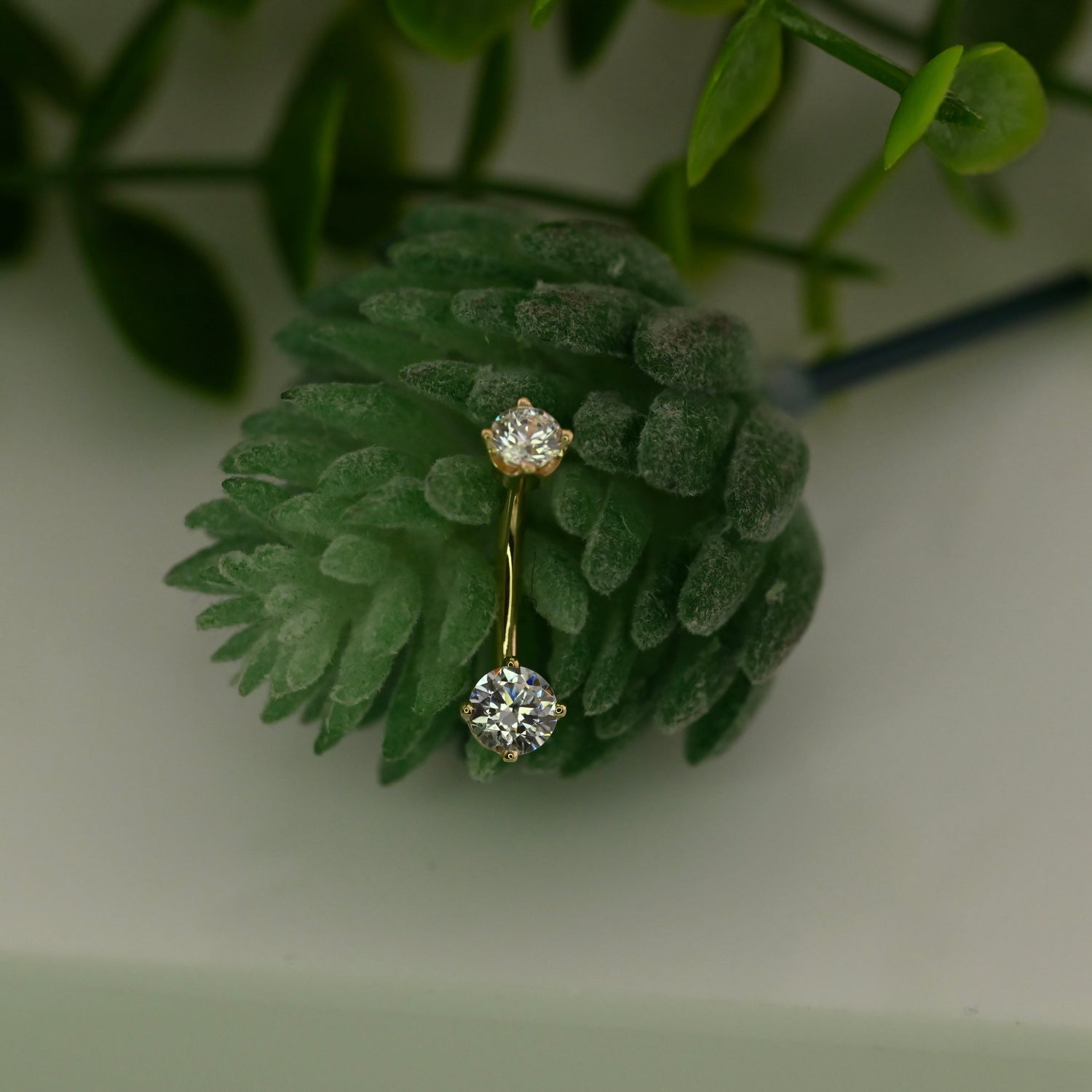 14k Gold curved barbell with threaded 4mm round prong top and fixed 5mm prong bottom.