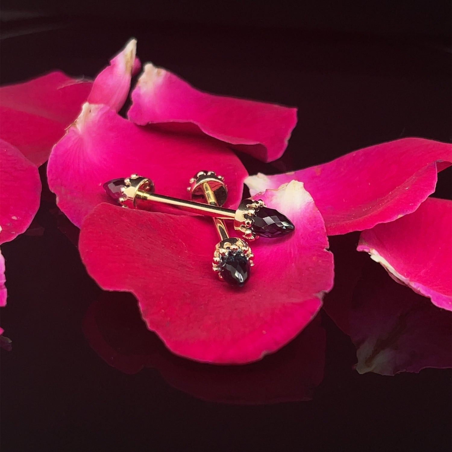 14K Straight Barbell with Back Threaded Gold Crown Setting featuring 3mm x 5mm Faceted Gemstone Bullets.