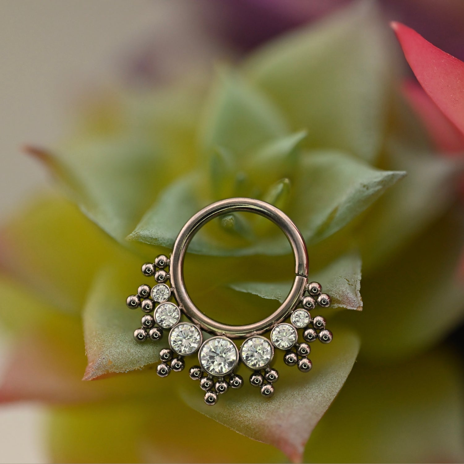 Titanium seam ring with 4mm, 3mm, 2mm, & 1.5mm gemstones and decorative beading