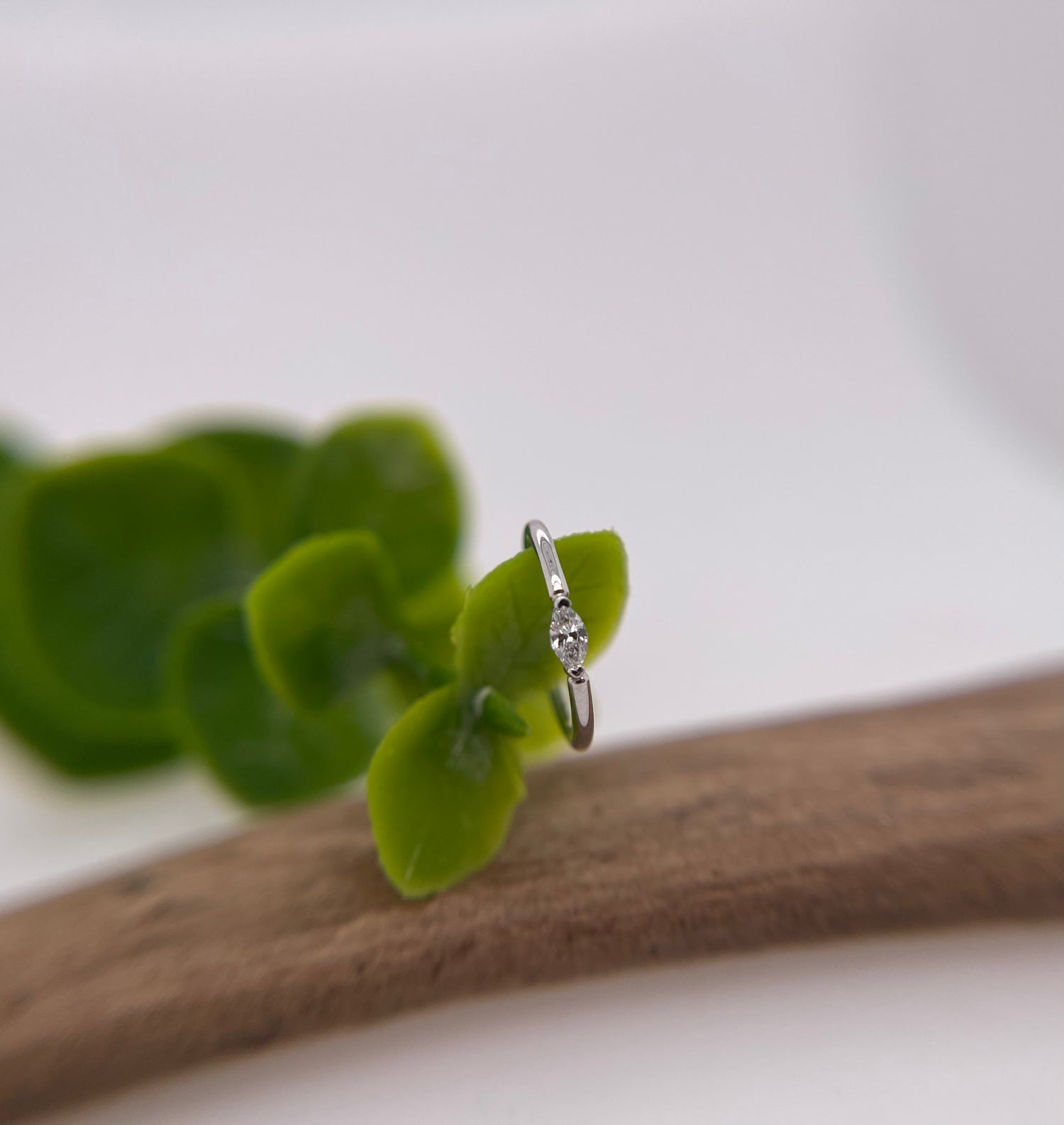 This elegant Marquise V Prong Fixed Ring is crafted from 14K gold, complete with a 3x1.5mm gemstone. Optimal for 18g piercings, it brings a unique touch to a variety of piercings. Its subtle shine adds understated glamour to any look.
