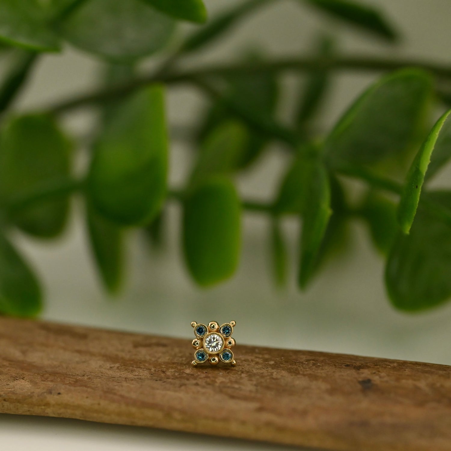 2mm Bezel Set Gemstones surrounded by 4 x 1mm Bezel Set Gemstones and Tiny Bead Accents.