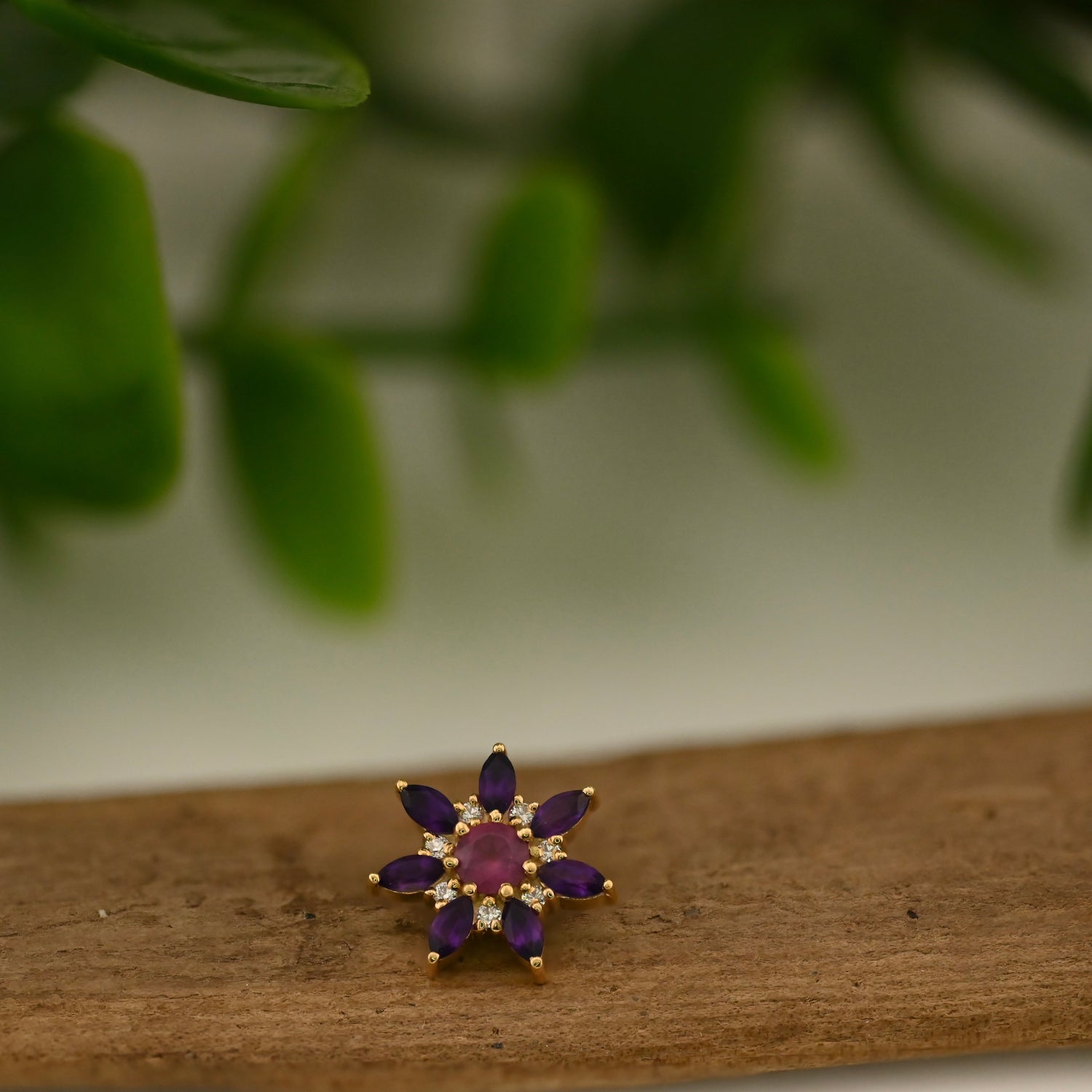 14K Gold with (7) 3mm x 1.5mm Marquise Cut Gems, (7) 1mm Round Cut Gems and a 3mm Round Cut Center Gem.