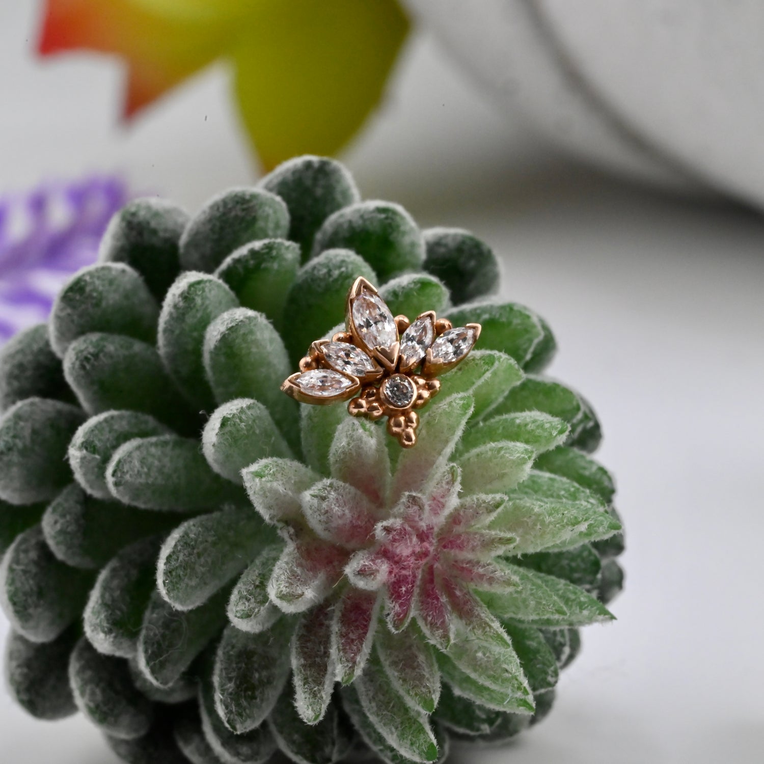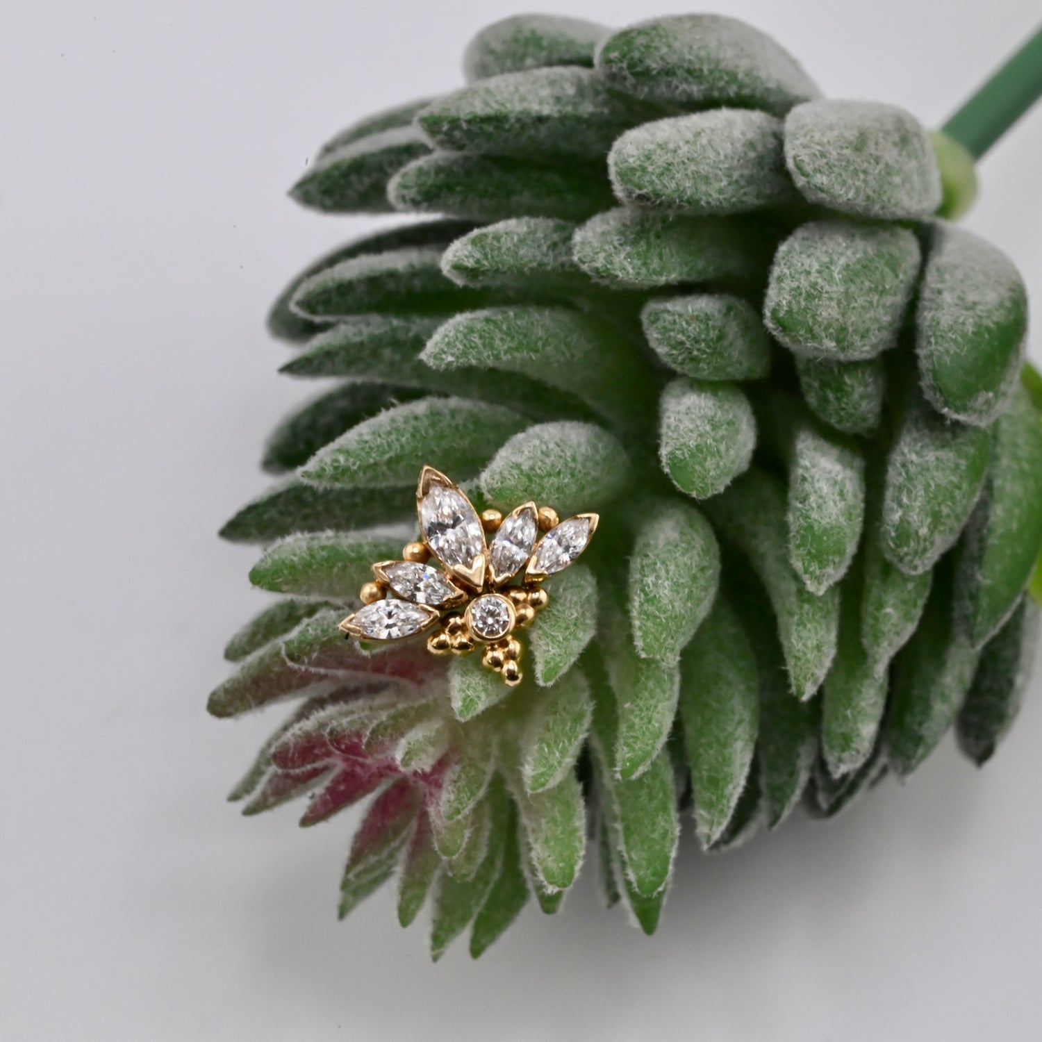 Discover the Zasu from the Homage Collection. This luxurious piece is crafted from 14k gold and features a stunning array of marquise gemstones with a round center gem and beaded accents. With its unique design and luxurious materials, the Zasu makes a beautiful addition to any jewelry collection.