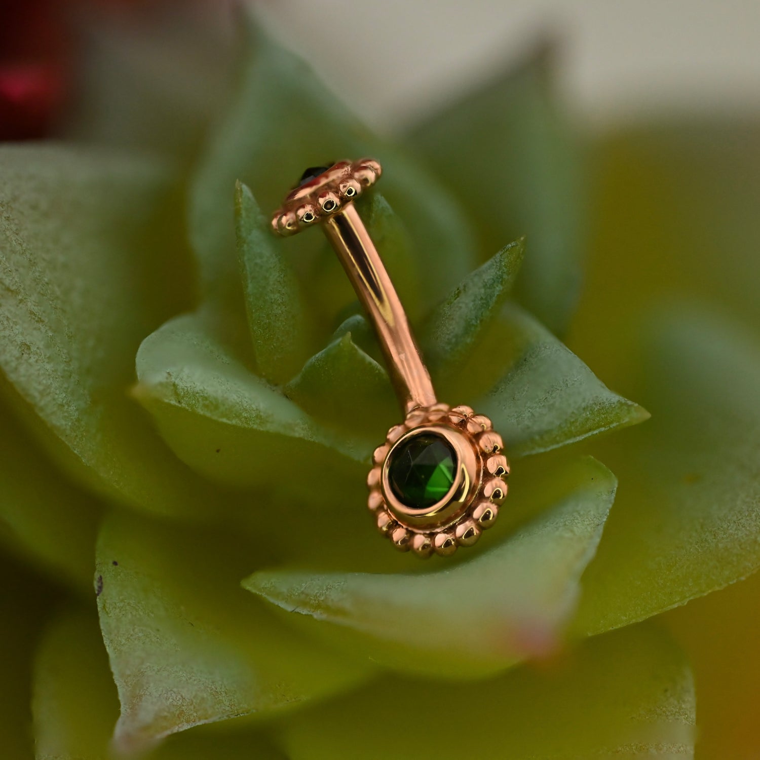 14K Gold Curved Barbell with Threaded 5mm Beaded Raine Top and Fixed 6mm Beaded Raine on Bottom. Both with 3mm Gems.