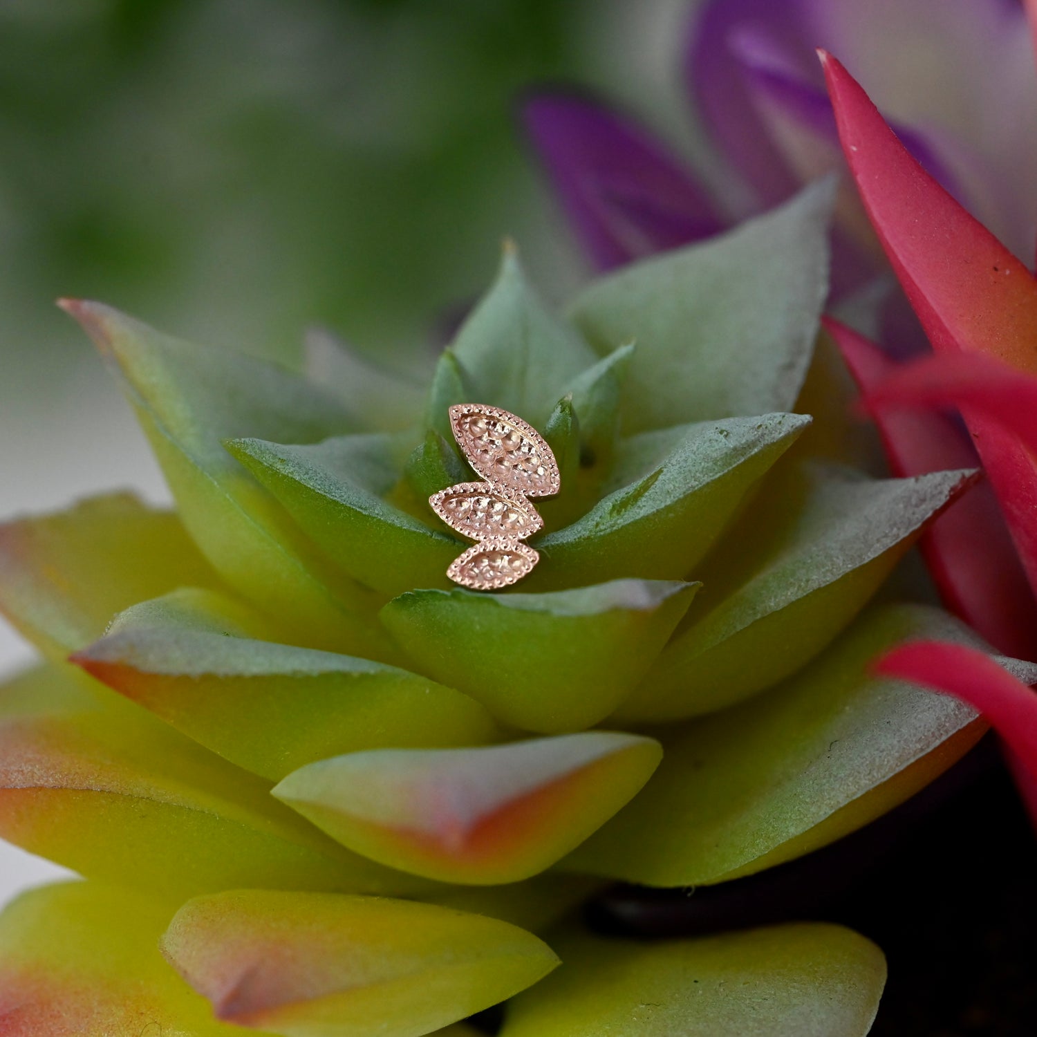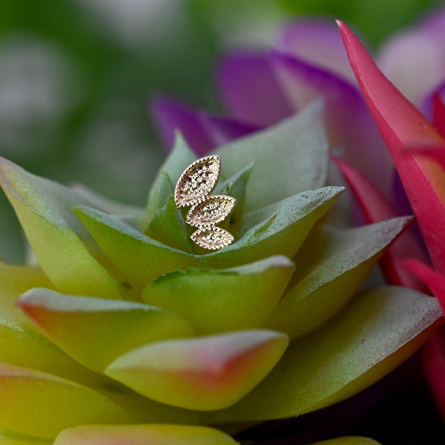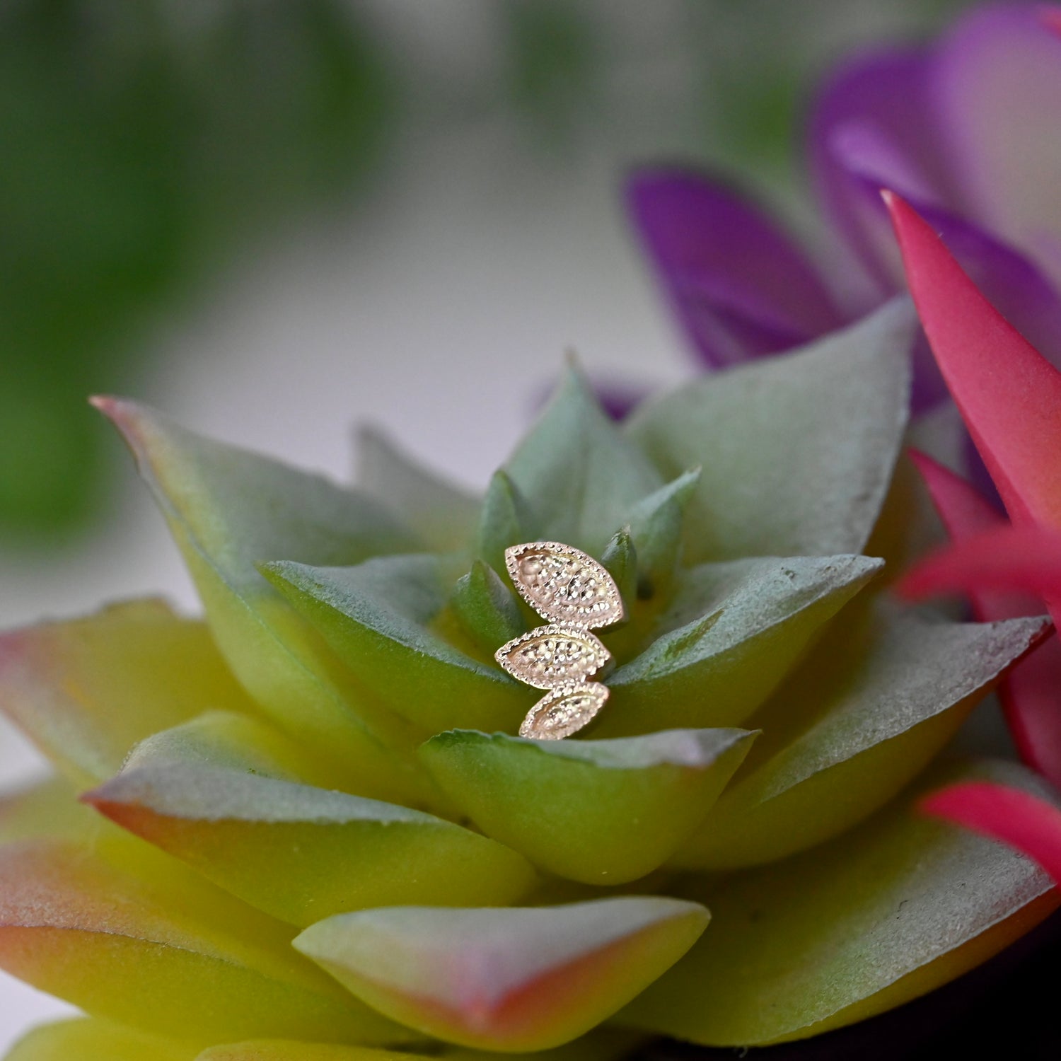 14K Gold 8mm x 5mm with 3 Marquise shapes with raised millgrain edges and hammered texture in the relief. Designed by Agave in Bloom.