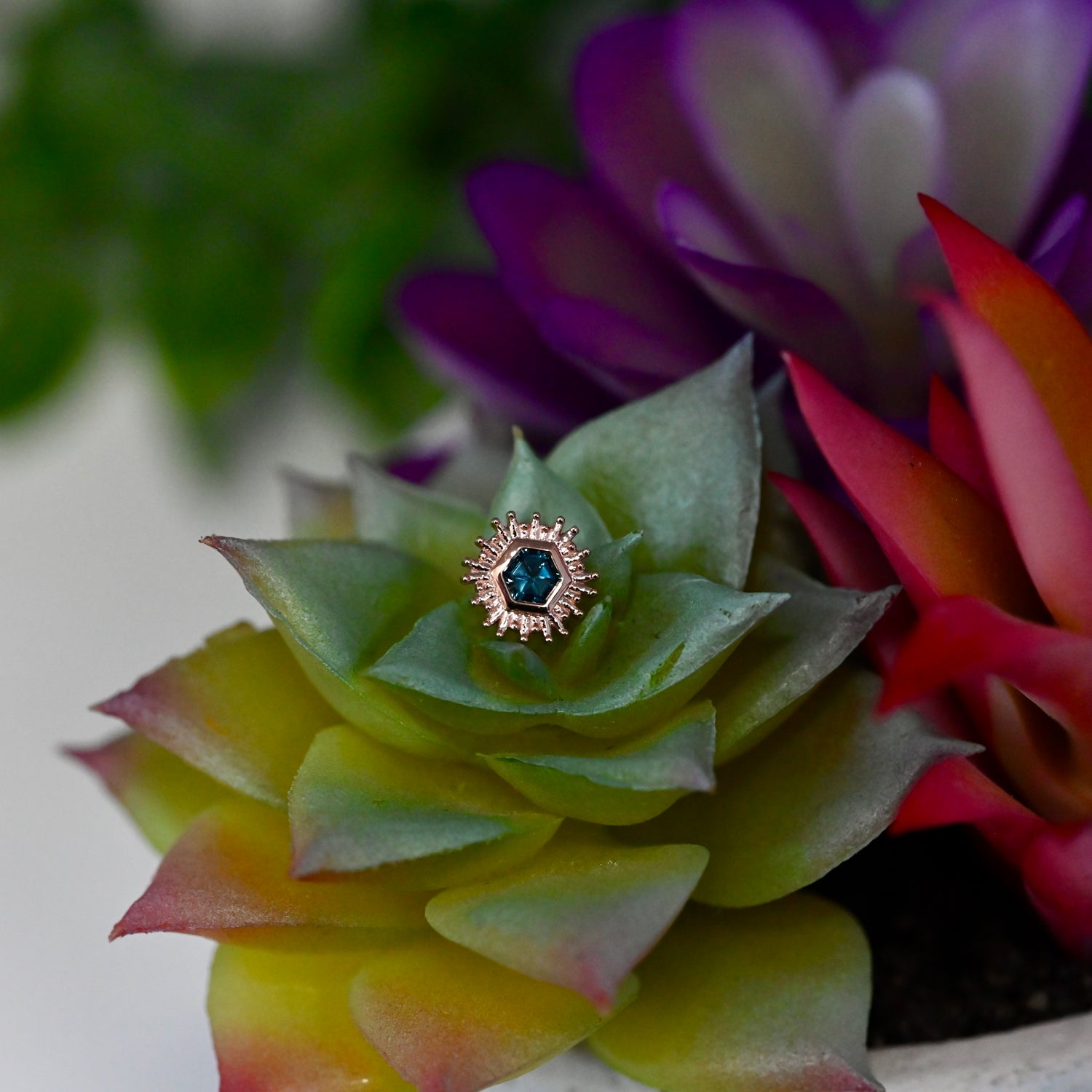 7.5mm Total Size with 3mm hexagon bezel with with small rays surrounding.