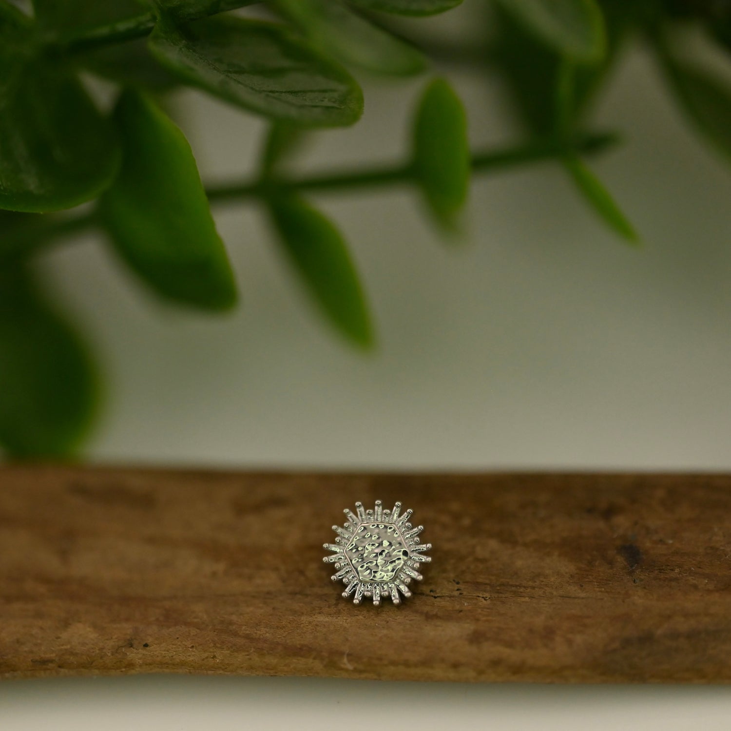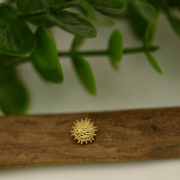 14K Gold Textured Flat Hexagon Shape with Small Rays Surrounding.