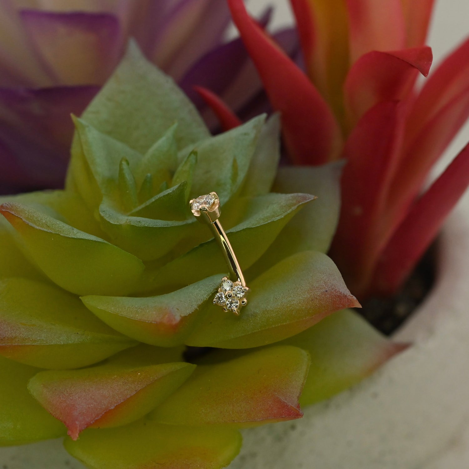 J-Curved Barbell with Threaded 2.5mm Round Prong Top and Threaded 3.5mm Reema Bottom with 1.25mm Gems.
