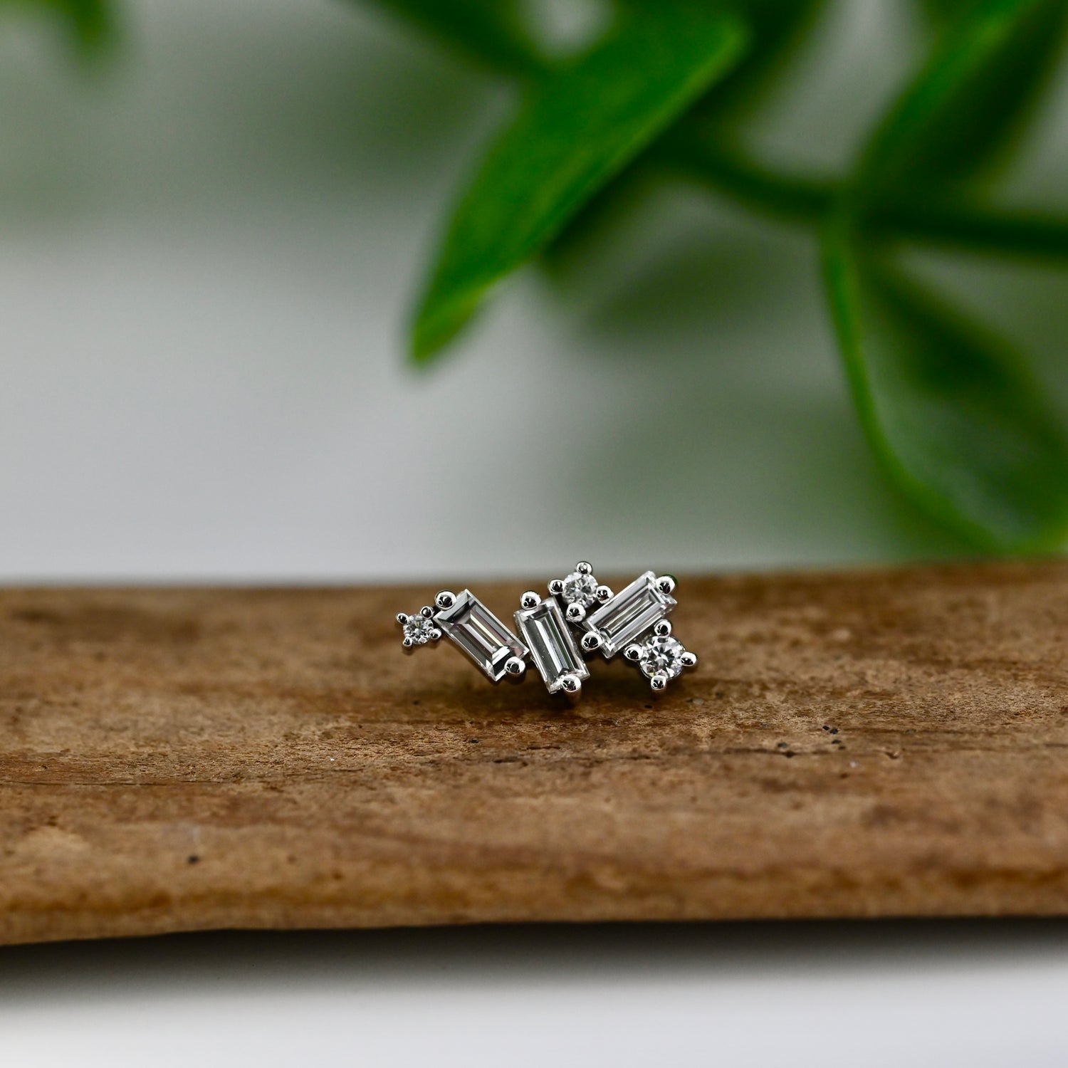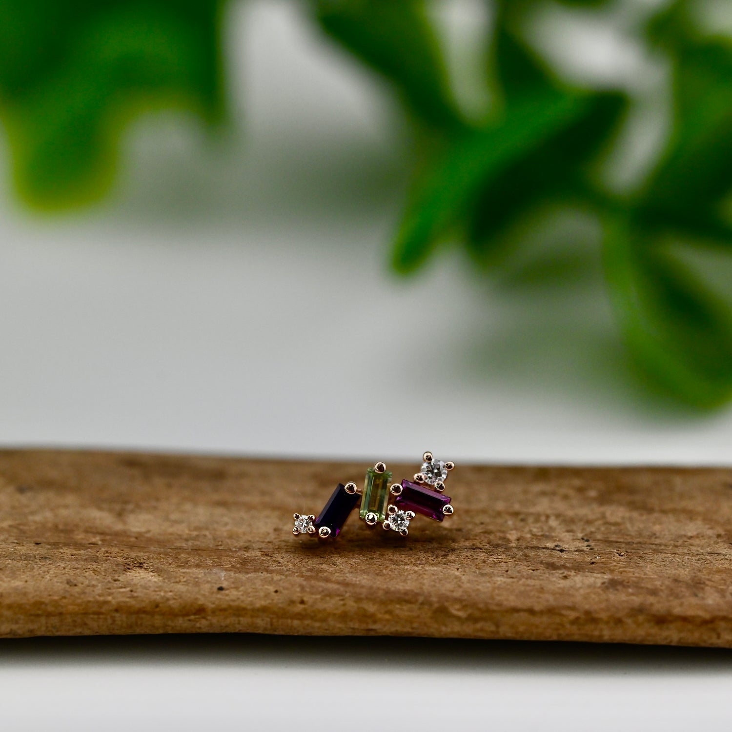 Strip of (3) 3mm x 1.5mm straight baguette prong set gems with 1.5mm, 1.25mm and 1mm round prong set gem accents. Top 1mm Gem curving to the right.