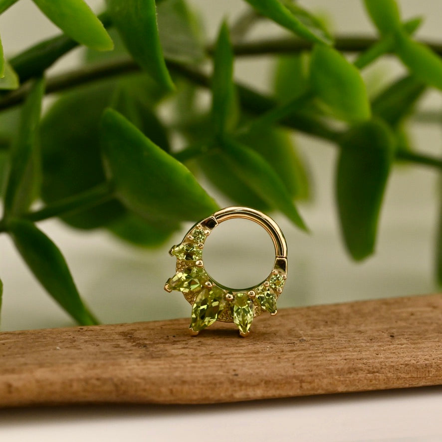 Penny is a 14k yellow gold hinge ring featuring 5 prong set Pear cut gemstones in a stunning graduation around the ring. There are two additional 1.5mm round prong accents on each side, and a hammered shield detail between each stone brings extra sparkle and shine.