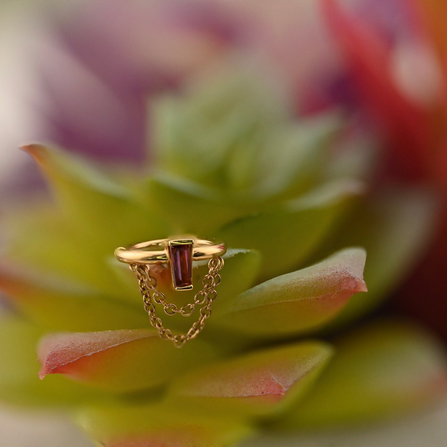 This Stunning 14K Gold seam ring with a 4mm x 2mm x 1.5mm Tapered Baguette gemstone with (2) 1mm Cable Chains soldered on either side of baguette is the perfect addition.
