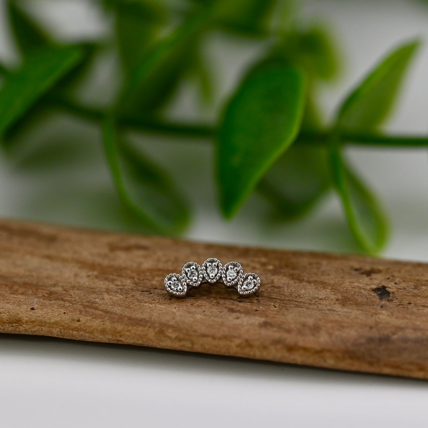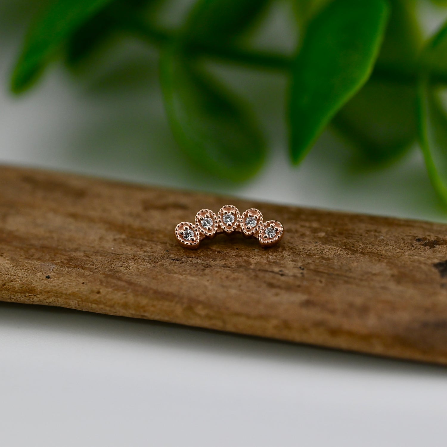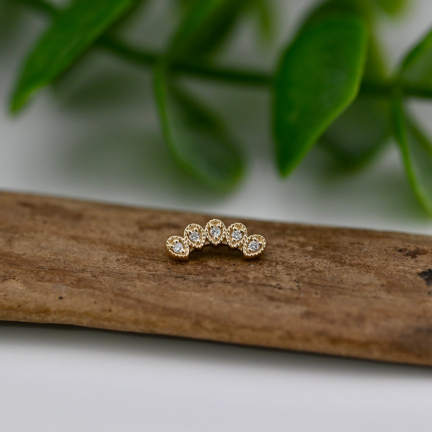 14K Gold Curved Cluster with (5) teardrop millgrain settings and set with 1mm gems.