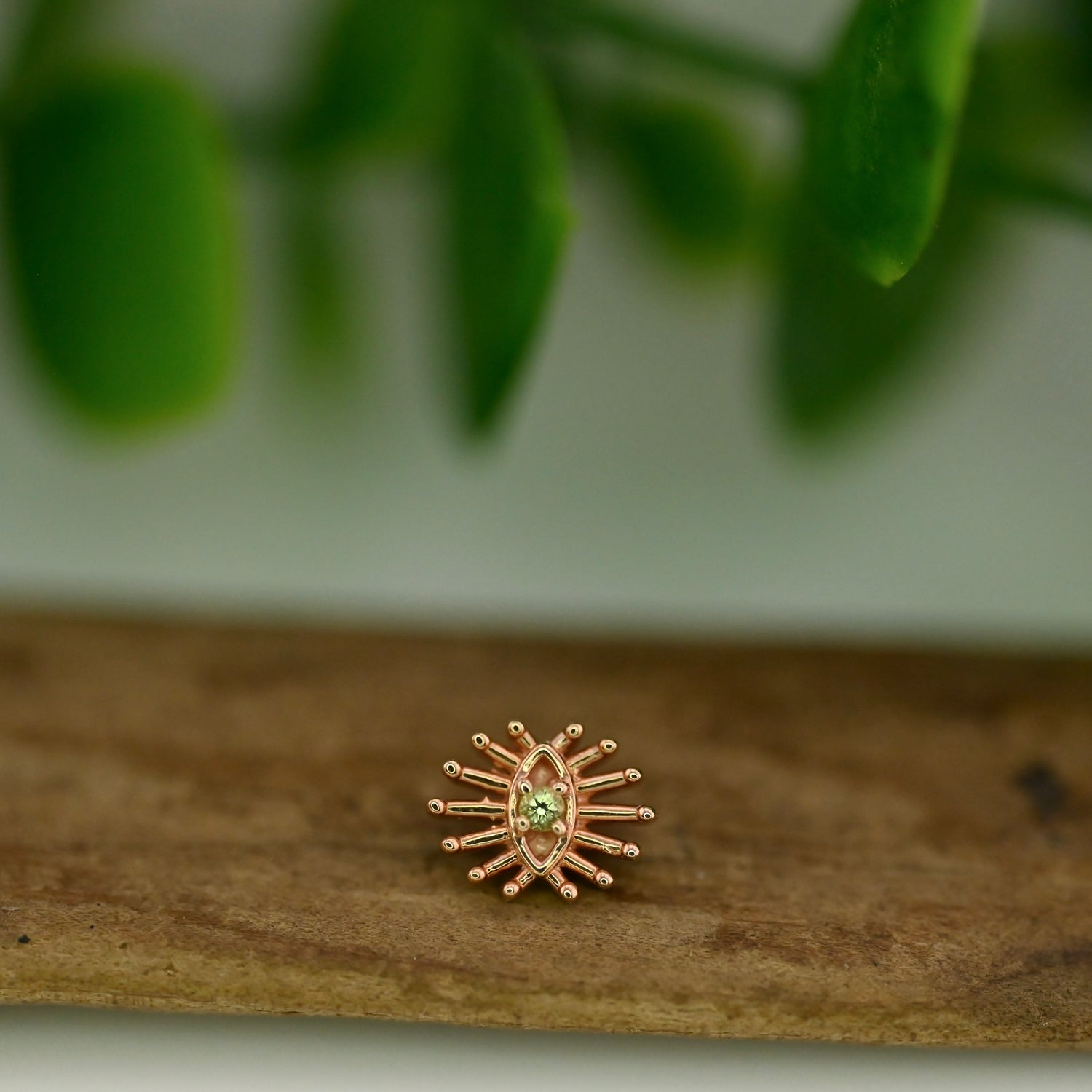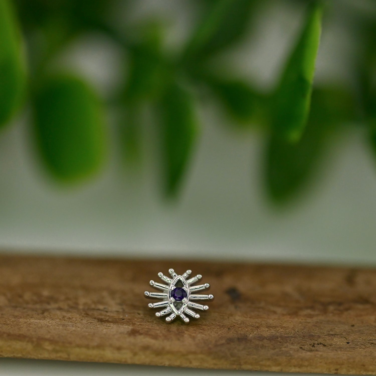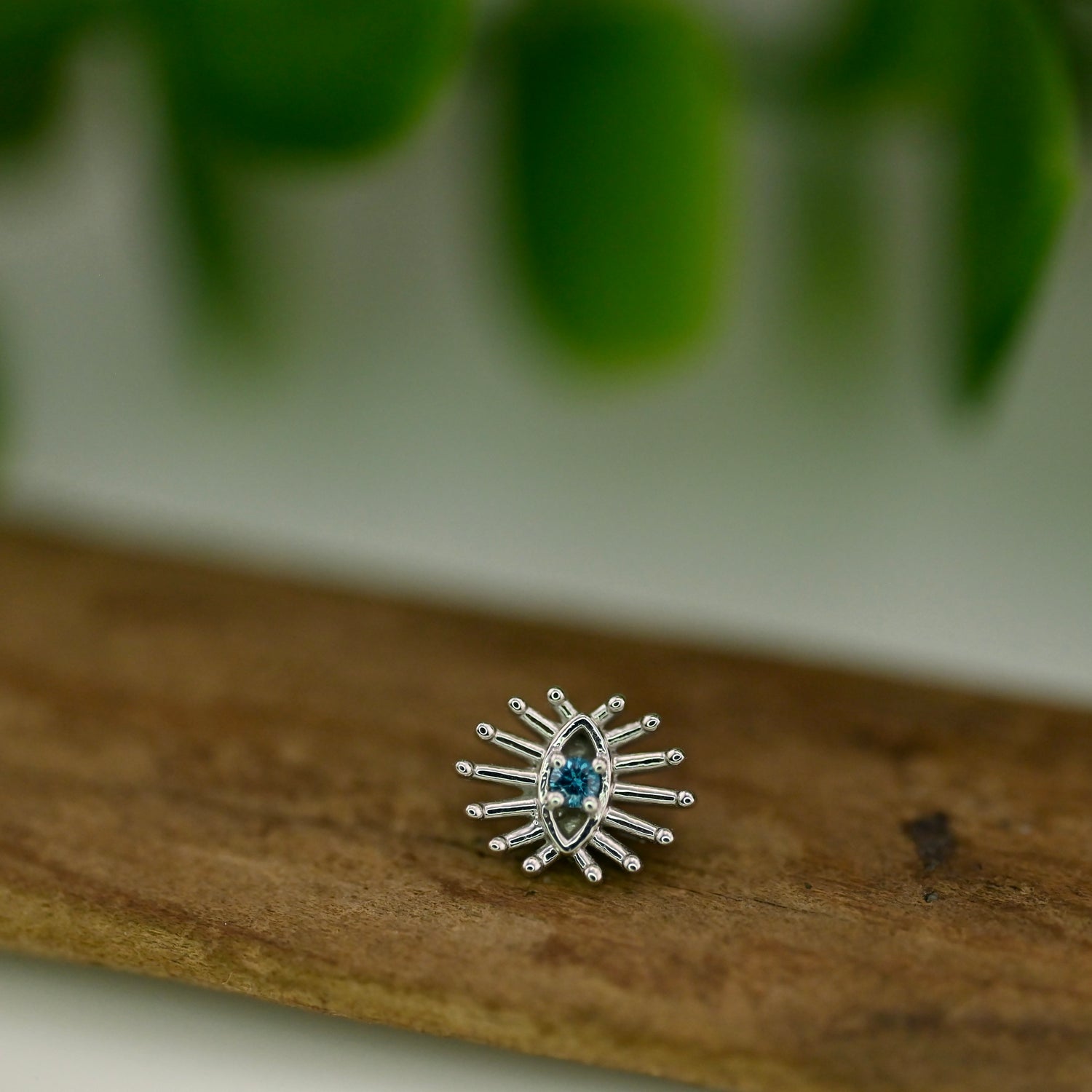 7.5mm x 6mm Eye with 1.5mm prong set gemstone center and graduating rays.